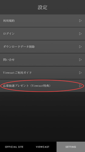 ①アプリ内よりログイン後、画面下「SETTING」のメニュー内に表示された「応募抽選プレゼント(Viewcast特典)」よりご応募ください