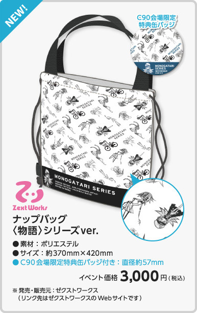 ウエダハジメ先生のイラストを使用したナップバック(C90会場限定特典缶バッジ付)、暦、ひたぎ、真宵、駿河ぬいぐるみ4種のリニューアルver.が発売予定です!是非、夏コミGiftブースにお越しくださいませ。