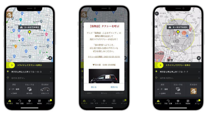 タクシーアプリ「S.RIDE」を起動し、画面左上に表示されている『傷物語-こよみヴァンプ-』のアイコンをタップし、「使用する」を選択することで配車可能。